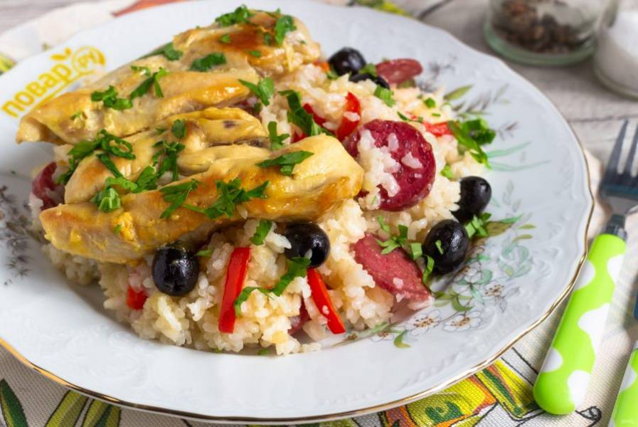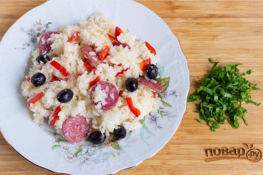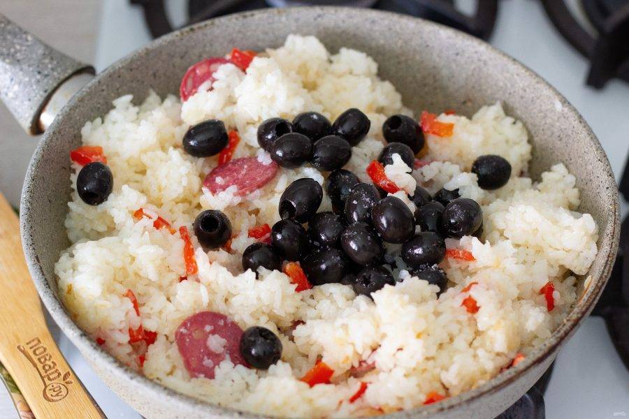 Готовый рис и маслины добавьте в сковороду, посолите всё по вкусу и аккуратно перемешайте.