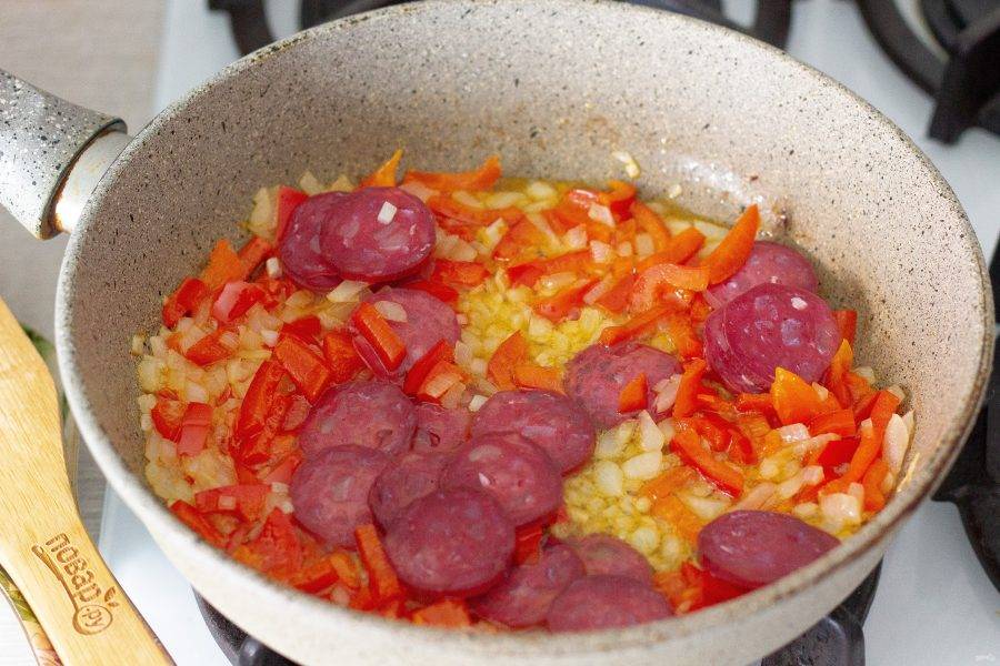 В сковороду налейте оставшееся масло. Если грудку жарили на сковороде, то можно использовать её же. Сначала обжариваем лук, затем добавляем перец, чеснок и в последнюю очередь на 1-2 минуты колбасу.