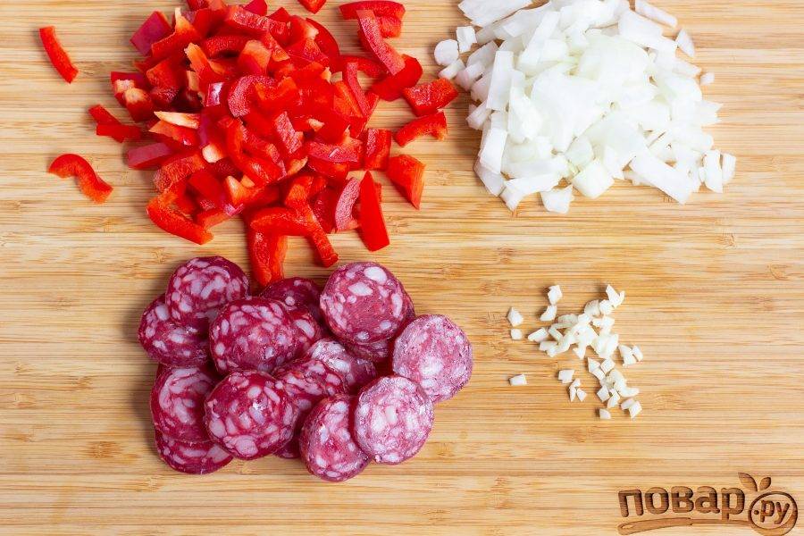 Тем временем нарежьте лук, чеснок, колбасу и перец.
