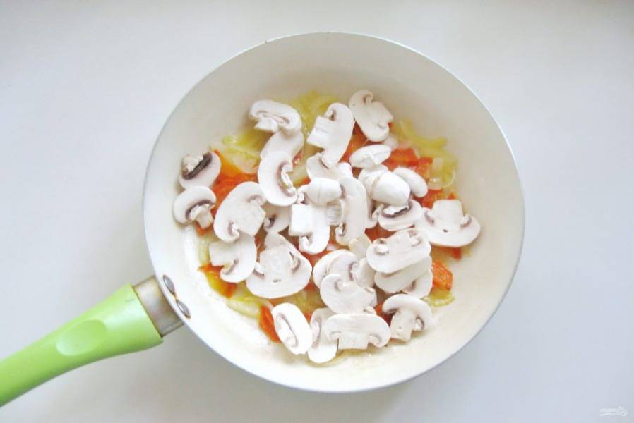 Шампиньоны очистите, нарежьте пластинами и добавьте к овощам. Налейте 100 мл воды и тушите морковь, лук, грибы под крышкой на небольшом огне 5-7 минут.