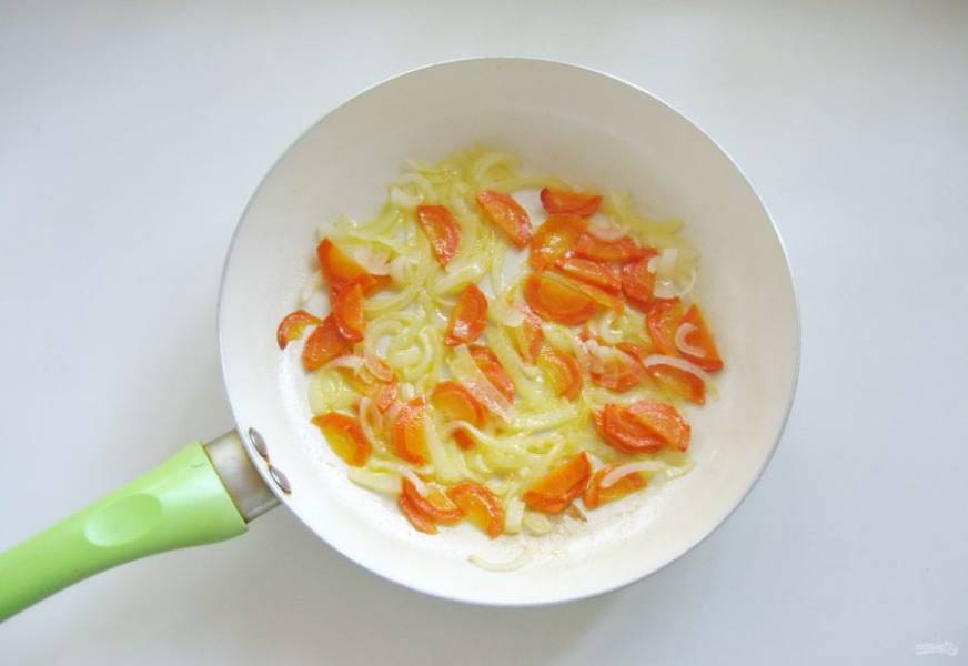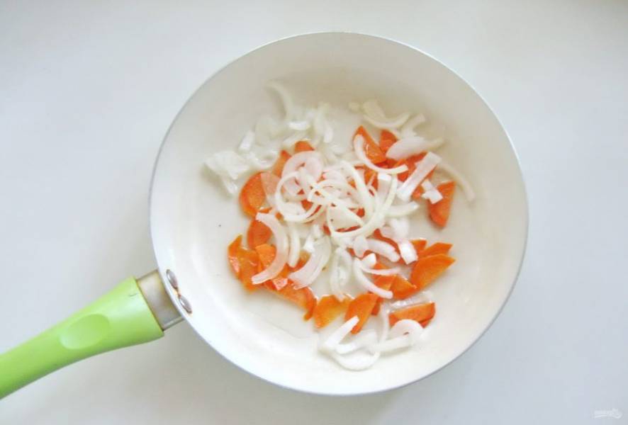 Налейте подсолнечное масло и слегка поджарьте лук с морковью.