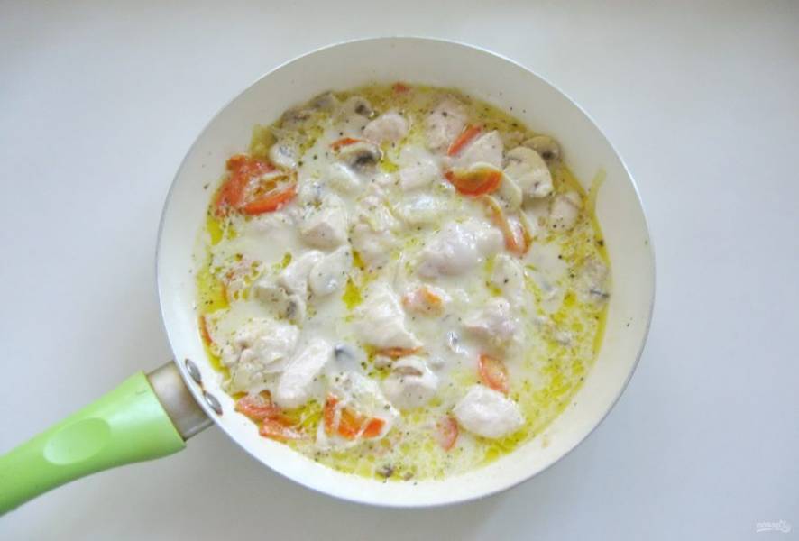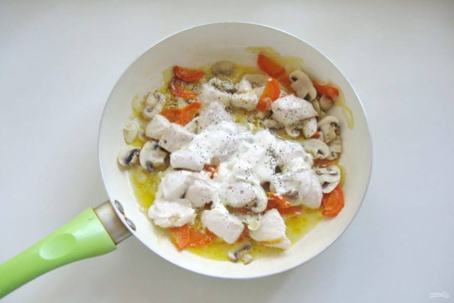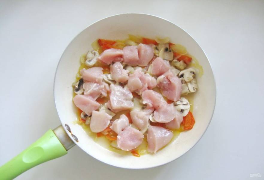 Куриное филе помойте, нарежьте небольшими кусочками. Выложите в сковороду с овощами и грибами.
