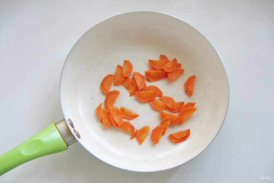 Одну небольшую морковку или половину крупной очистите, помойте и нарежьте. Выложите в сковороду.