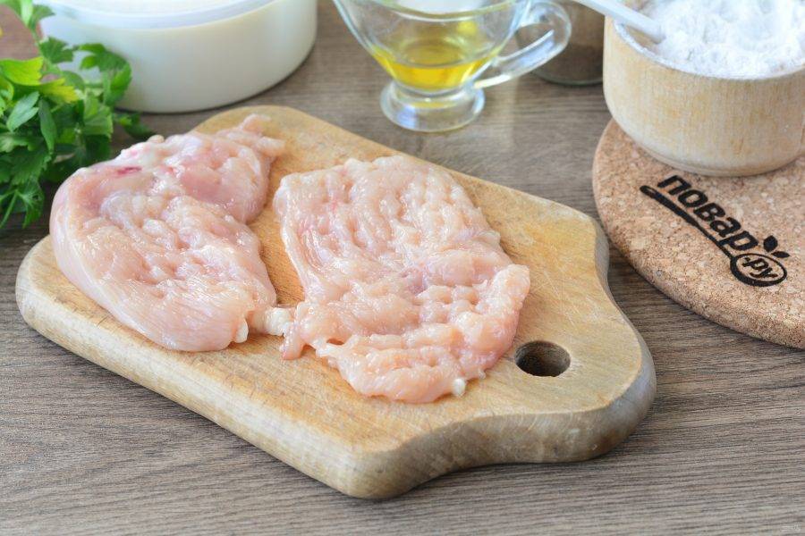 Нарежьте пластинами куриное филе. Отбейте кулинарным молоточком.