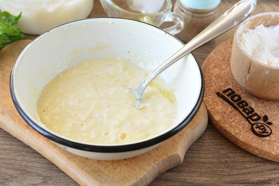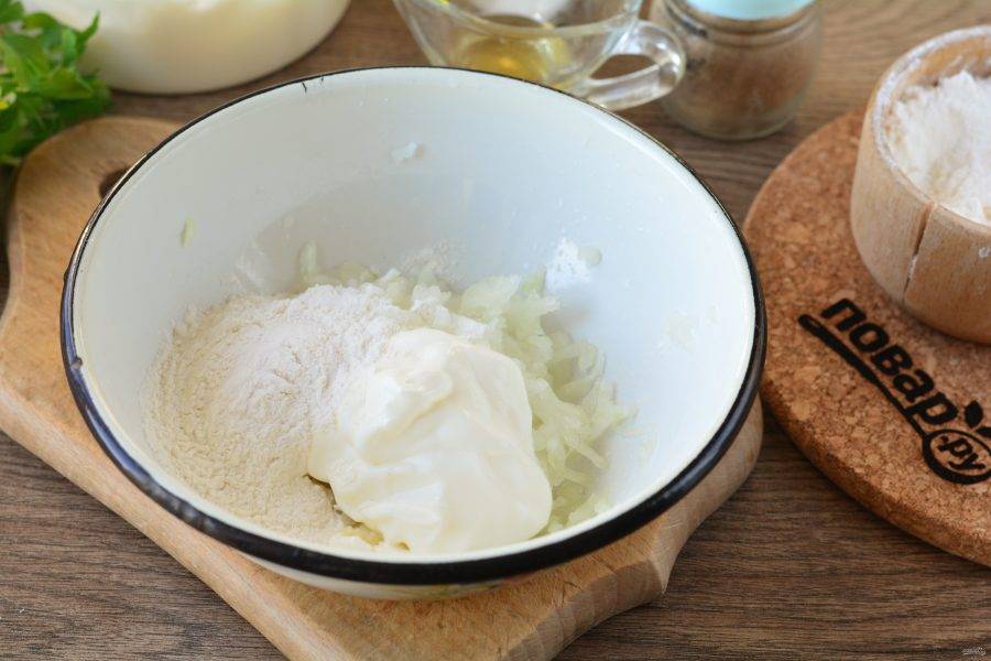Добавьте сметану и муку, перемешайте, чтобы не было комочков.