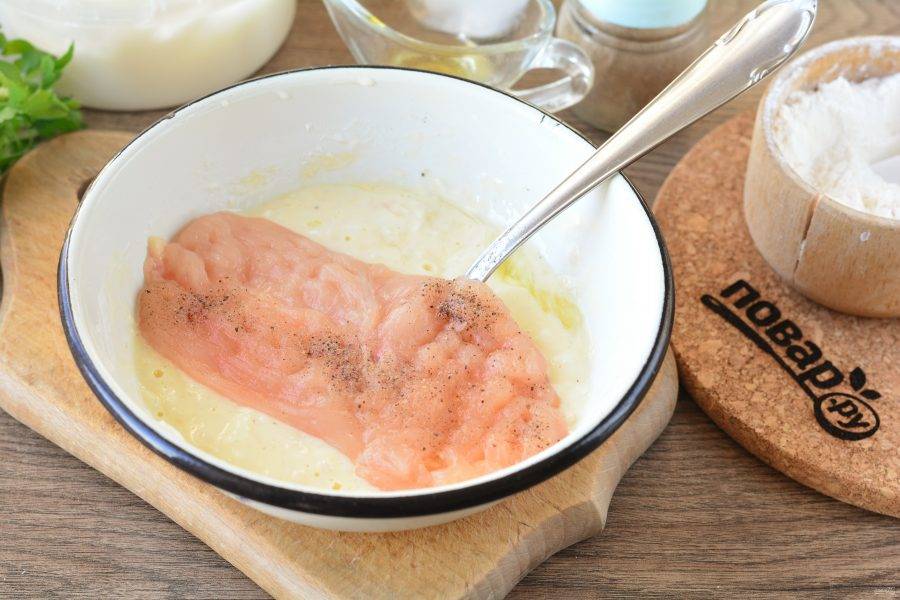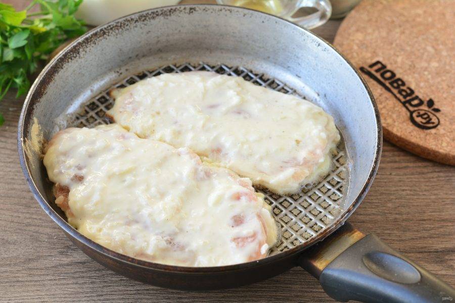 Отбивные посолите и поперчите, окуните в кляр с двух сторон.