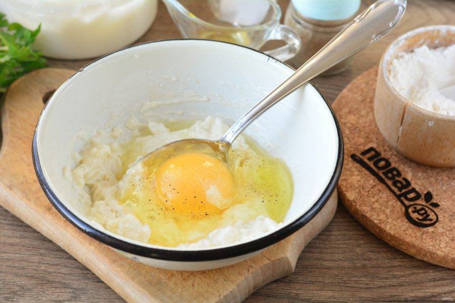 Вбейте куриное яйцо. Посолите и поперчите по вкусу.