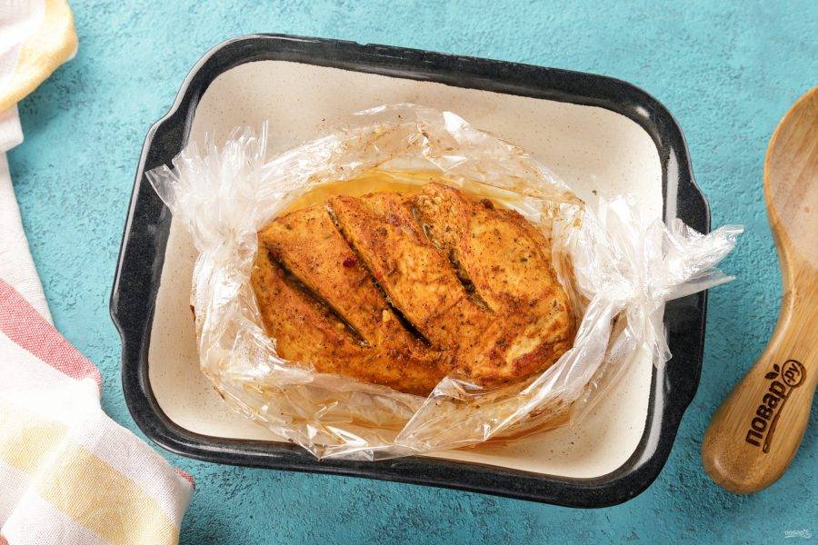 Затем поместите филе в рукав для запекания. Завяжите концы, а рукав проткните ножом, для выхода пара.