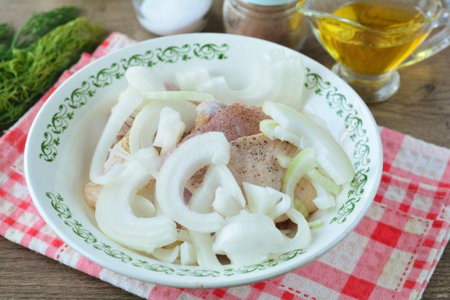 Промойте куриные бедрышки, слейте остатки воды или просушите мясо на салфетках.