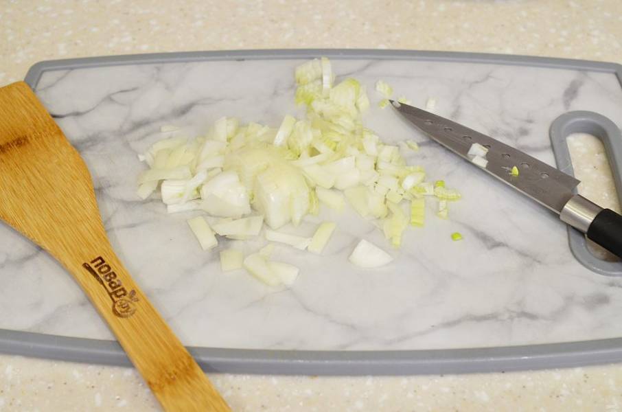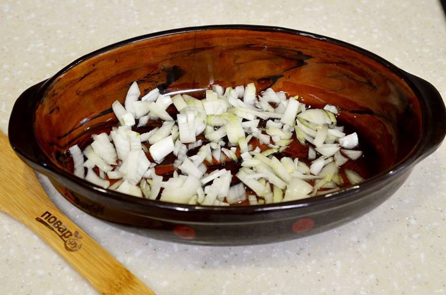 4. В жаропрочную форму положите лук, влейте масло. Поставьте в духовку при 190 градусах на 10 минут.