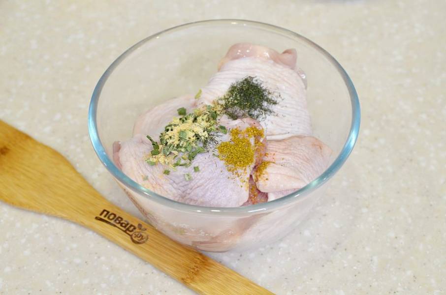 2. Бедра посолите, поперчите, добавьте любимые специи.