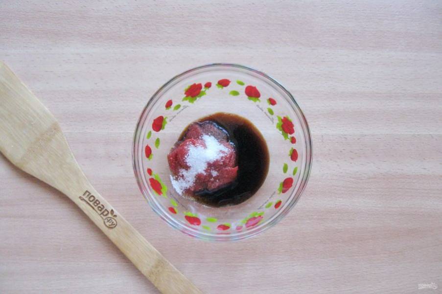 Приготовьте соус. В мисочку налейте соевый соус и выложите томатную пасту.