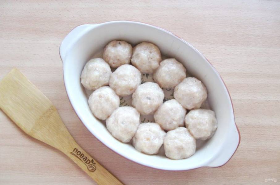 Из приготовленного фарша сформируйте шарики — боллы и выложите в форму для запекания.