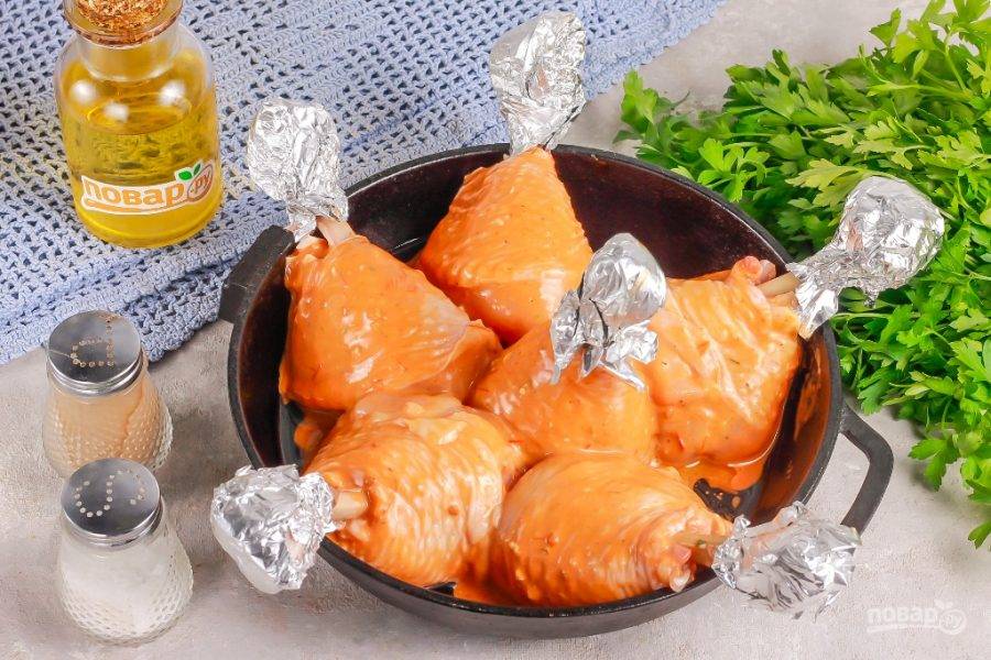 Разогрейте духовку до 200 градусов. Обверните ножку каждой голени фольгой, чтобы она не подгорела в процессе запекания. Затем смажьте форму маслом и выложите в нее голени, чтобы они по минимуму соприкасались друг с другом.