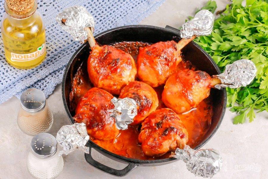 Подайте к столу румяные голени с любым гарниром и не забудьте удалить фольгу с ножки.