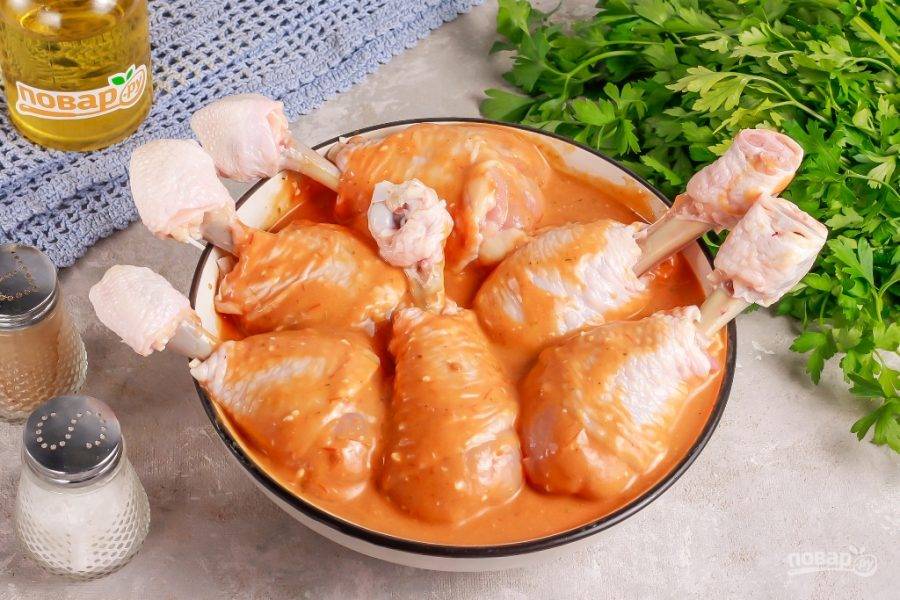 Выложите голени в приготовленный соус и проверните каждую из них, чтобы мясо полностью им пропиталось. Оставьте мясо в соусе примерно на 1-2 часа.