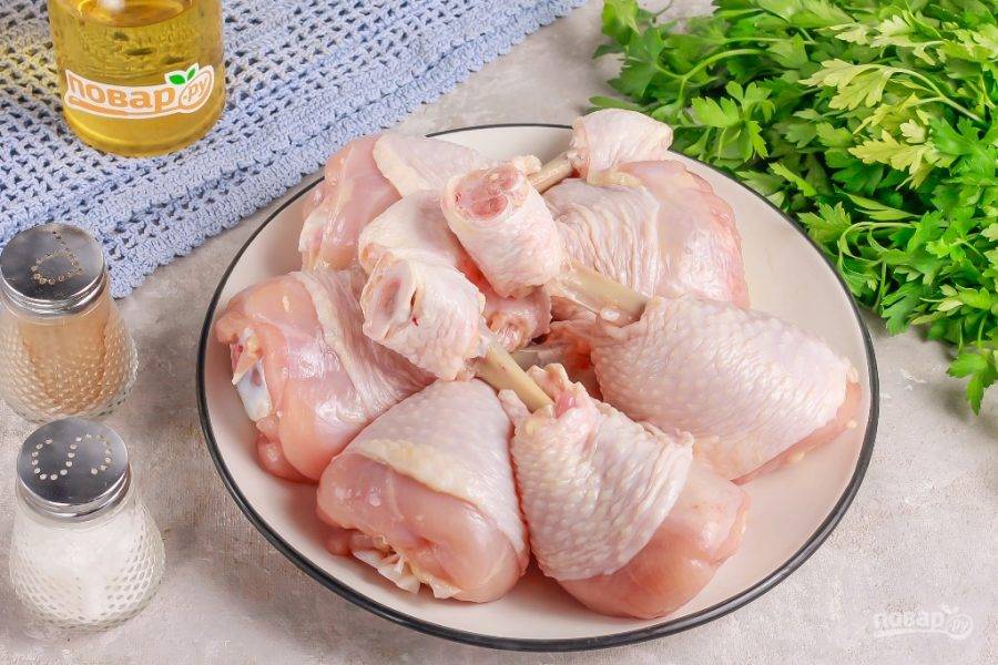 Промойте куриные голени в воде и обсушите бумажными салфетками. Если голени будут влажными, то к ним плохо пристанет соус. Затем чуть ниже основного сустава подрежьте мякоть, как будто собираетесь его снять с кости. Вырежьте сухожилия, они похожи на белые шнурочки. Стяните мякоть вниз, но не до конца, чтобы обнажить косточку. Такие манипуляции проделайте и с остальными голенями.
