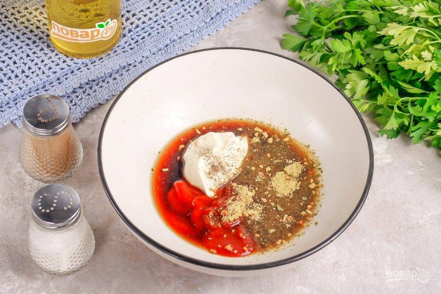 В глубокой емкости соедините кетчуп чили, майонез, соевый соус, приправу для курицы, соль и молотый черный перец. Если блюдо будут есть и дети, то замените кетчуп чили на более нежный. Аккуратно все перемешайте.