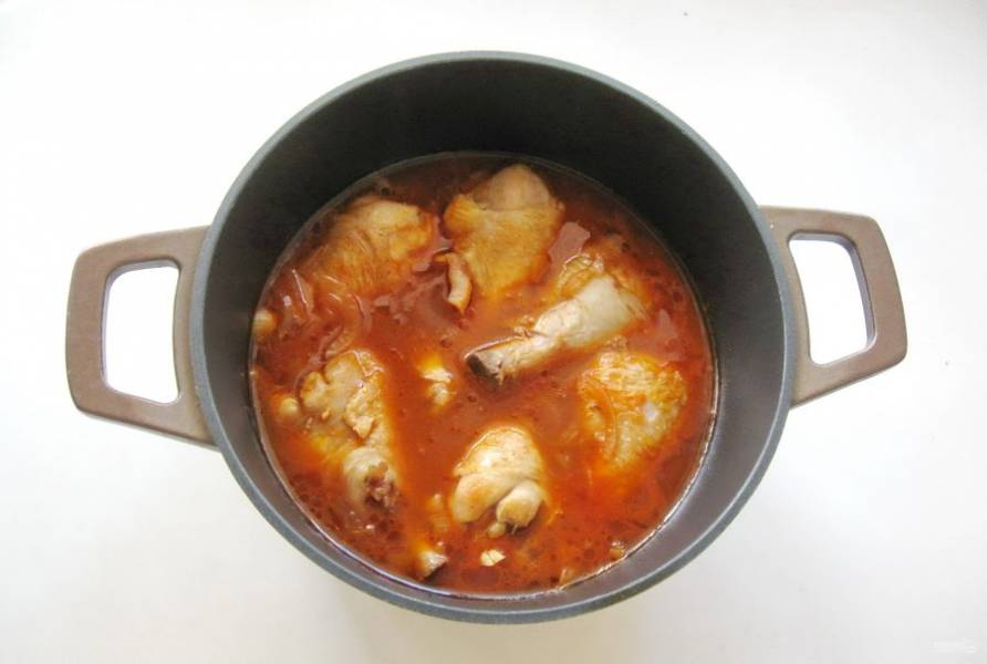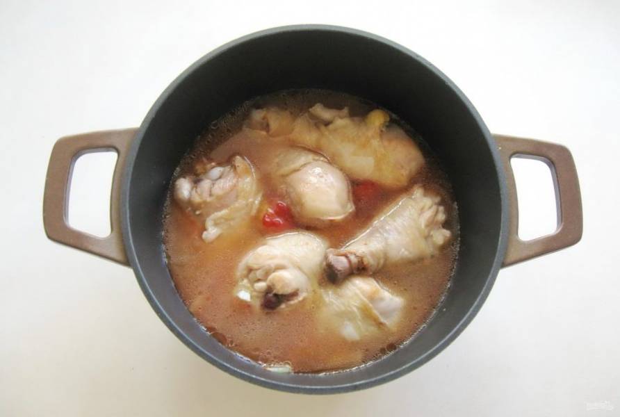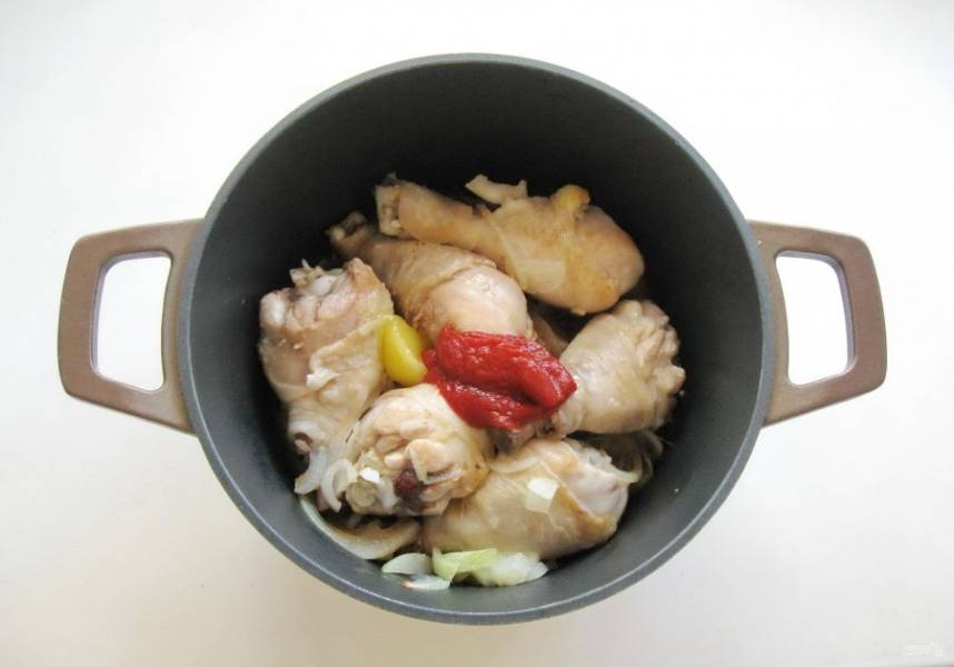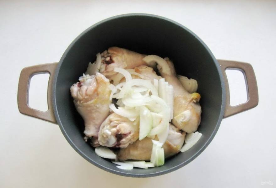 Влейте подсолнечное масло и обжарьте голени до легкого золотистого цвета. Репчатый лук очистите, помойте и нарежьте. Добавьте к голеням. Тушите лук с курицей, помешивая в течение 10 минут.
