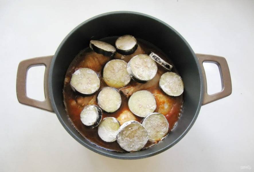 Баклажан нарежьте кружками и обваляйте каждый кусочек в муке. Выложите в кастрюлю к куриными голеням.