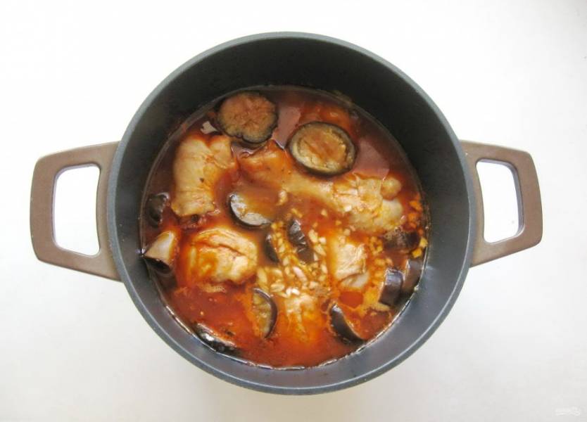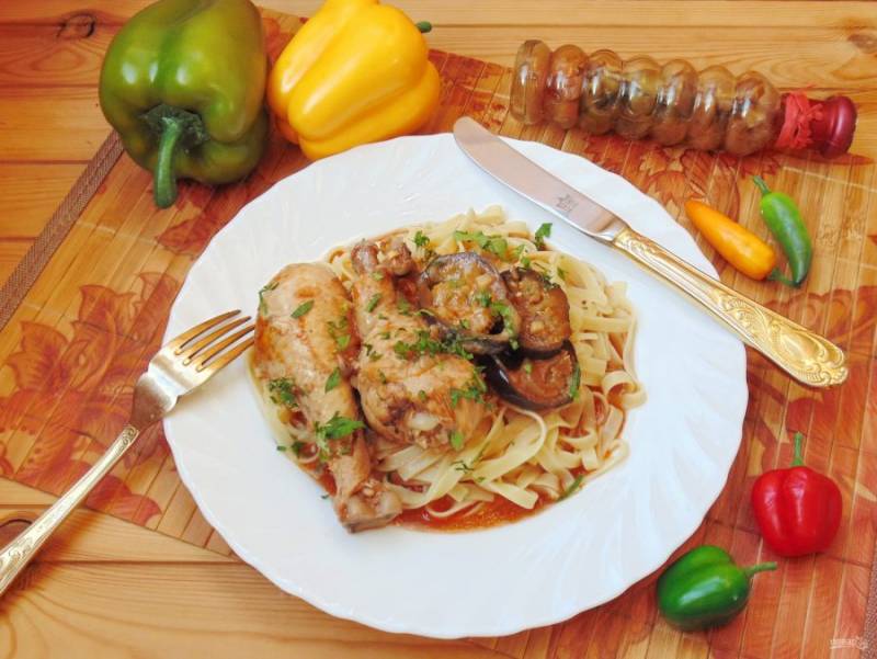 Куриные голени с баклажанами в соусе готовы. Подавайте с макаронами, картофельным пюре или отварным рисом.