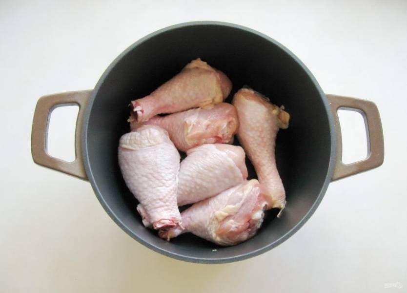 Куриные голени помойте, обсушите бумажным полотенцем и выложите в кастрюлю с толстым дном или казан.
