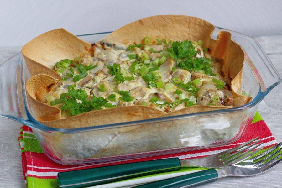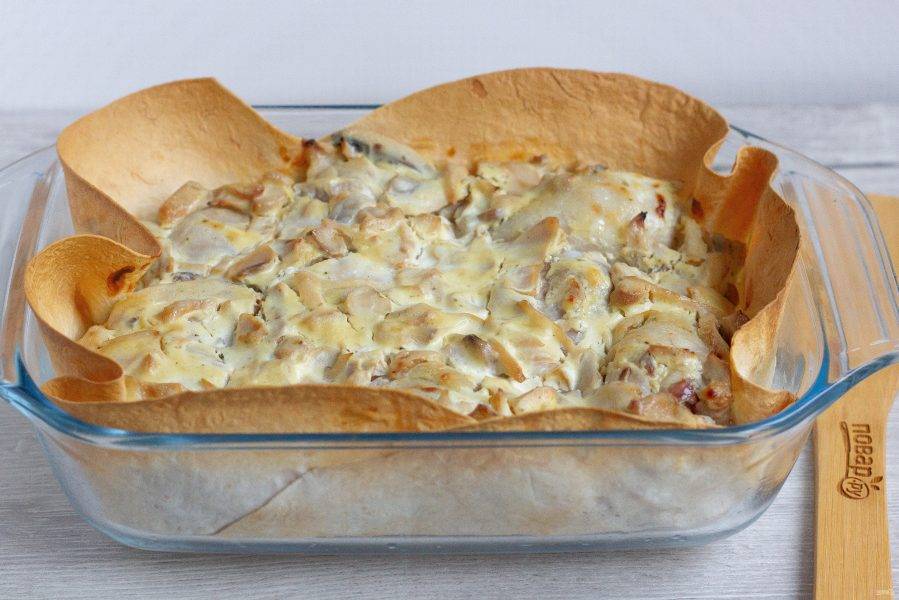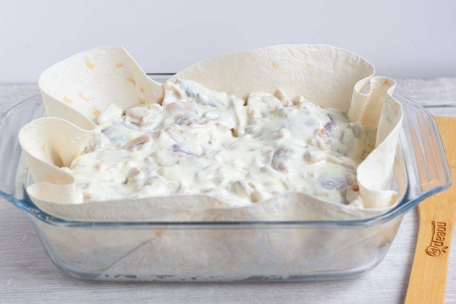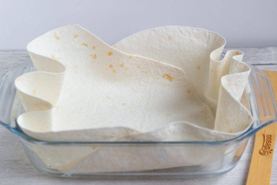 Форму смажьте растительным маслом и выложите лаваш, чтобы получились бортики.