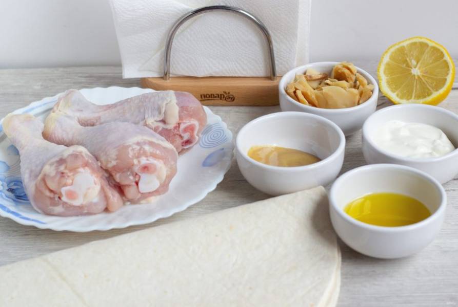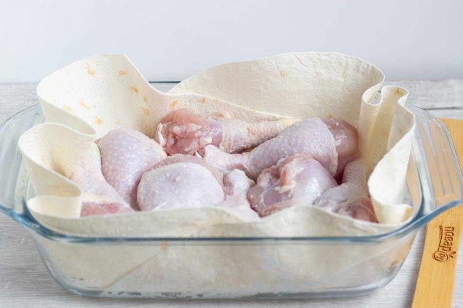 Голени помойте, обсушите бумажным полотенцем и подсолите по вкусу. Выложите на лаваш.
