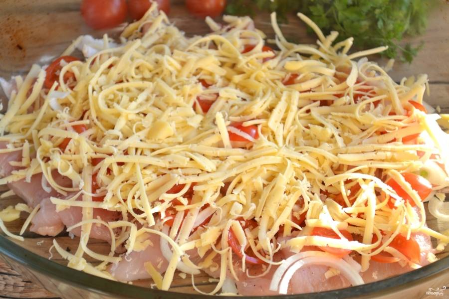 Форму для запекания смажьте растительным маслом, на дно одним слоем выложите пластины куриного филе. Сверху разложите лук, нарезанный полукольцами.