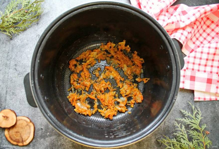 Репчатый лук порежьте, морковь натрите на средней терке. В чашу мультиварки налейте растительное масло, выложите овощи и готовьте в режиме "Тушение" в течение 10 минут, перемешивая пару раз.