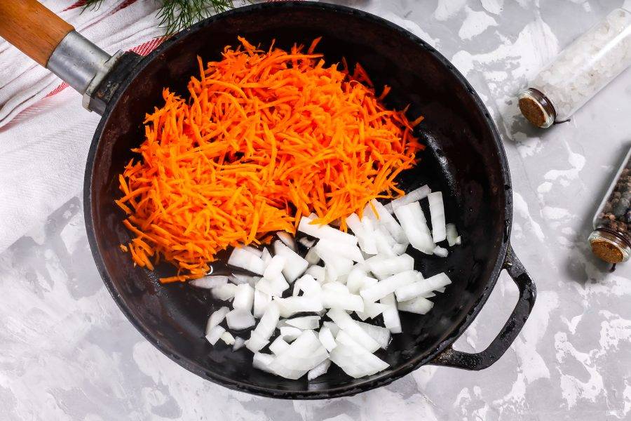 Очистите морковь и лук от кожуры, промойте в воде. Натрите морковь на терке: с мелкими или с крупными ячейками. Лук нарежьте кубиками. Отпассеруйте овощные нарезки в растительном масле в течение 3-4 минут, предварительно прогрев его на сковороде.