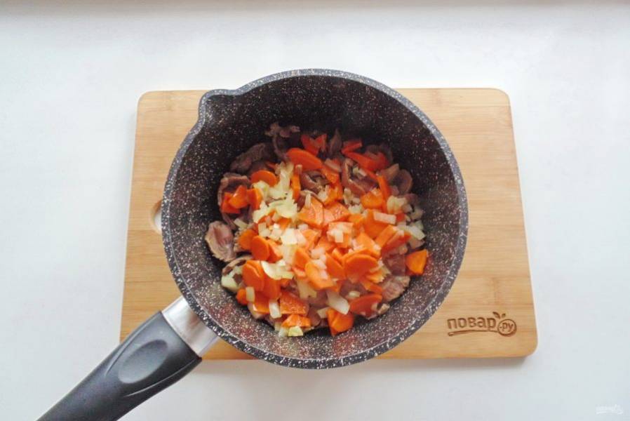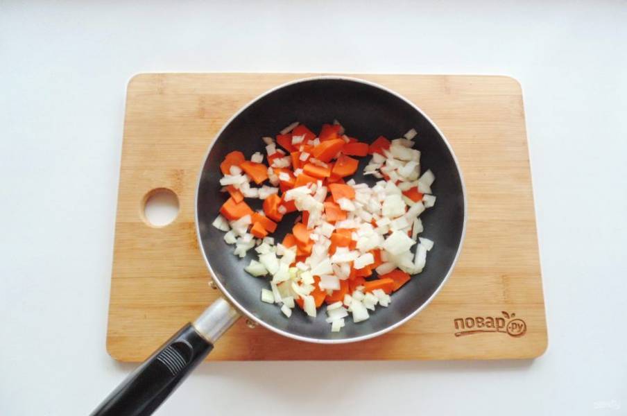 Морковь и лук очистите, помойте и нарежьте. Выложите в сковороду, налейте растительное масло и пассеруйте 5-6 минут.