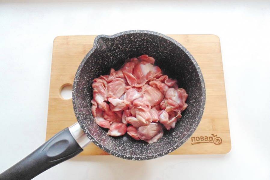 Куриные желудки обработайте. Удалите жир, жилки, пленку, если они есть. Тщательно помойте и выложите в кастрюлю с толстым дном.