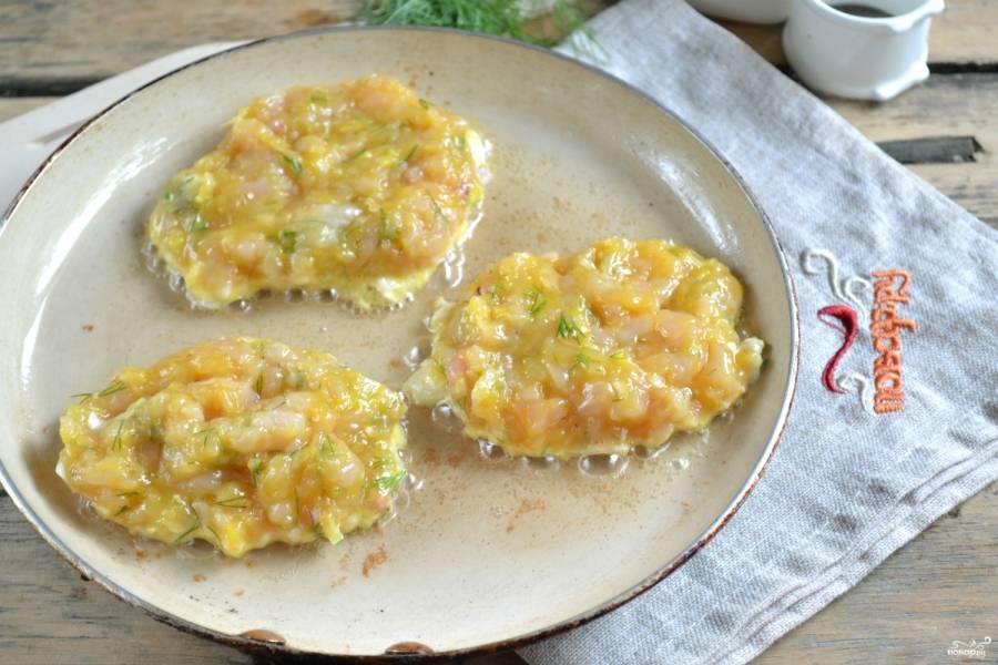 В сковороду налейте подсолнечного масла, хорошенько разогрейте. Ложкой выложите на сковороду фарш, обжарьте с каждой стороны до румяной корочки. Жарьте на среднем огне по 2-3 минуты с каждой стороны.
