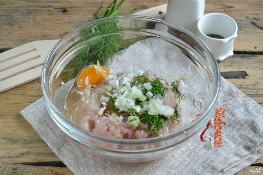 В миску с перемолотым мясом добавьте мелко порезанный лук и зелень укропа. Вбейте яйцо. Посолите по вкусу. Хорошо перемешайте.