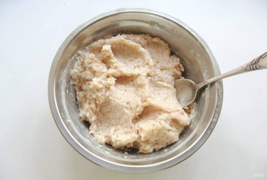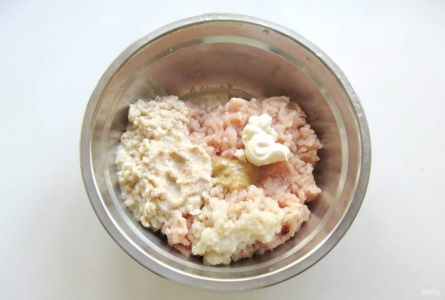 Курное филе, очищенные лук и чеснок помойте. Белый хлеб или батон залейте кипяченой водой, через пять минут отожмите от воды. Пропустите через мясорубку филе, лук, чеснок и батон. Добавьте майонез и горчицу.