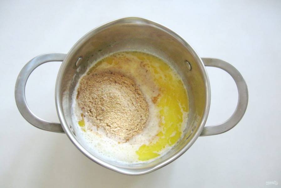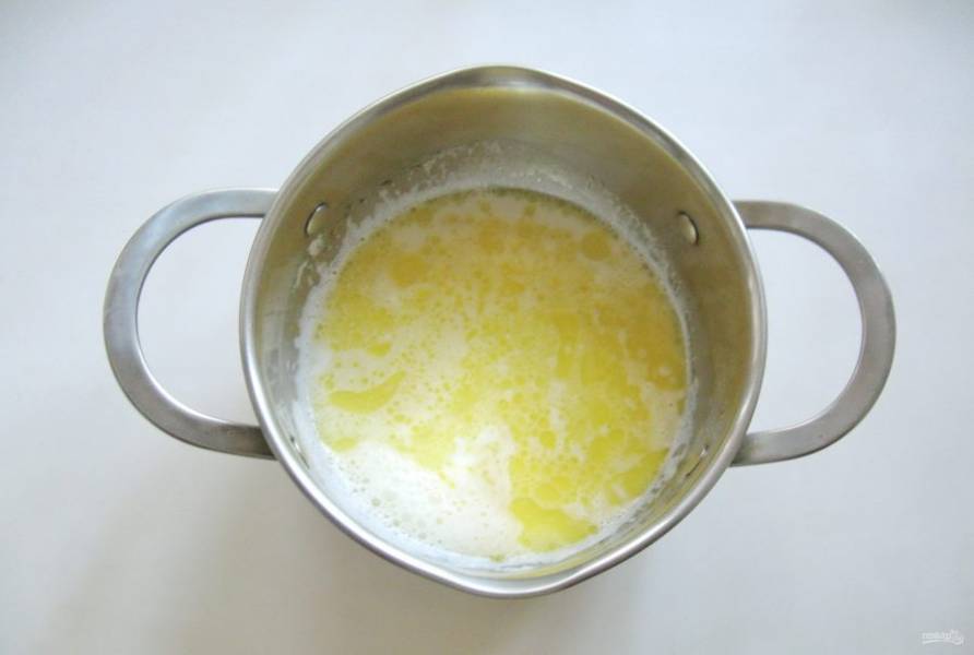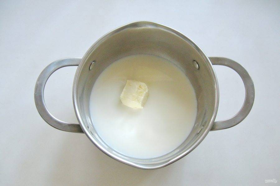 Сливки налейте в кастрюлю, добавьте сливочное масло.