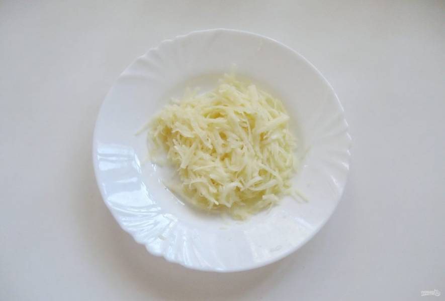 Картофель очистите, помойте и натрите на терке. Немного отожмите от сока и чуть-чуть посолите.