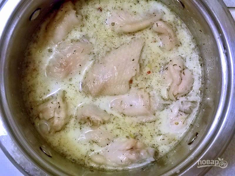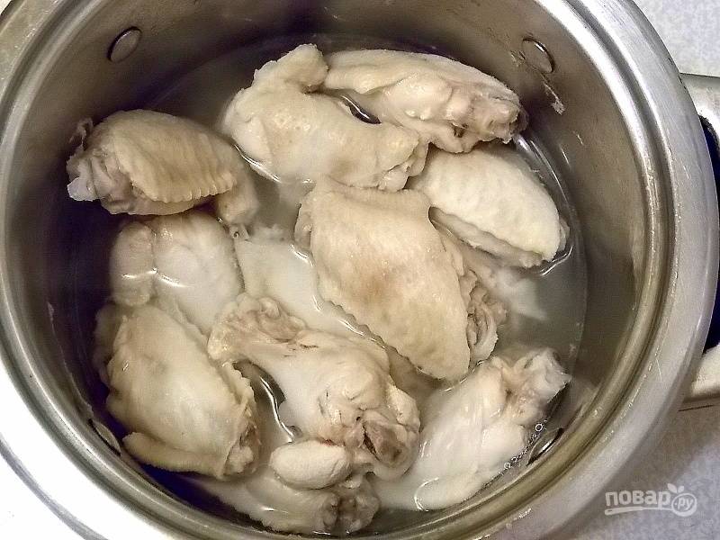 Крылышки доведите до кипения и варите 3 минуты. Слейте воду и остудите.
