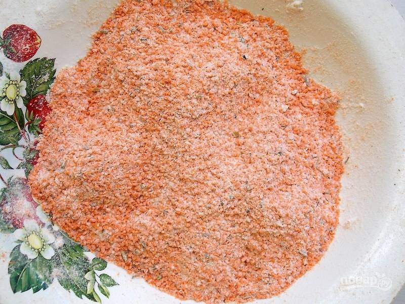Смешайте муку, панировочные сухари, специи, соль, острый перец.