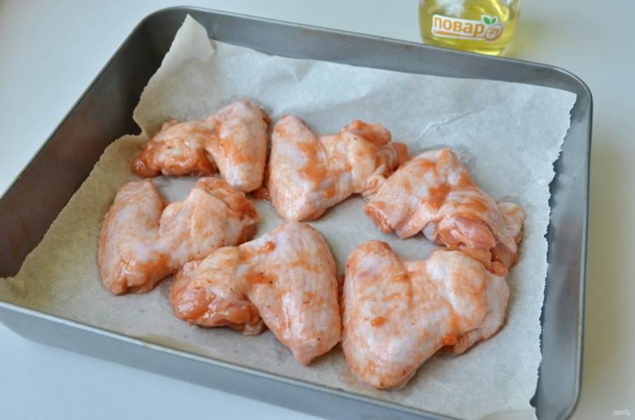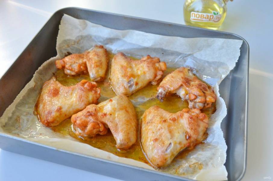 4. Духовку разогрейте до 200 градусов. Противень застелите бумагой. Положите крылышки и отправьте запекаться на 30-35 минут.