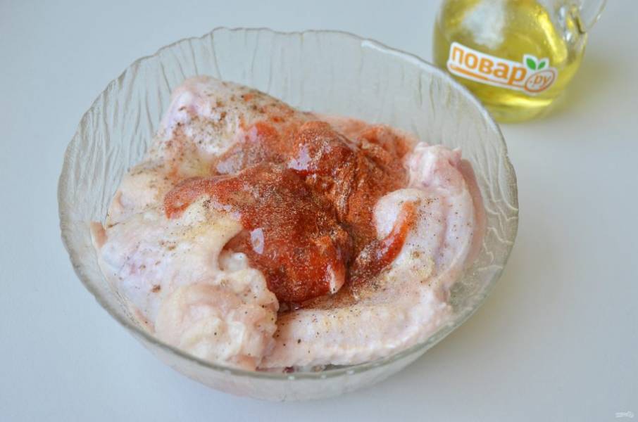 2. Положите крылья в глубокую удобную миску для маринования. Добавьте соль, сальсу, перец черный, чили, паприку, сахар, масло растительное, чесночный порошок, соус.