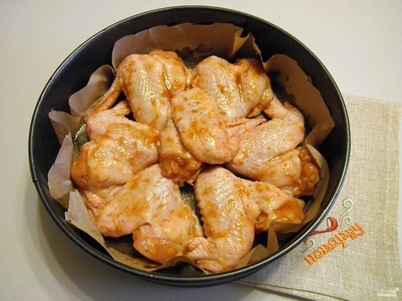 Замаринуйте крылышки в в медовом соусе и отправьте в холодильник на 30 минут.