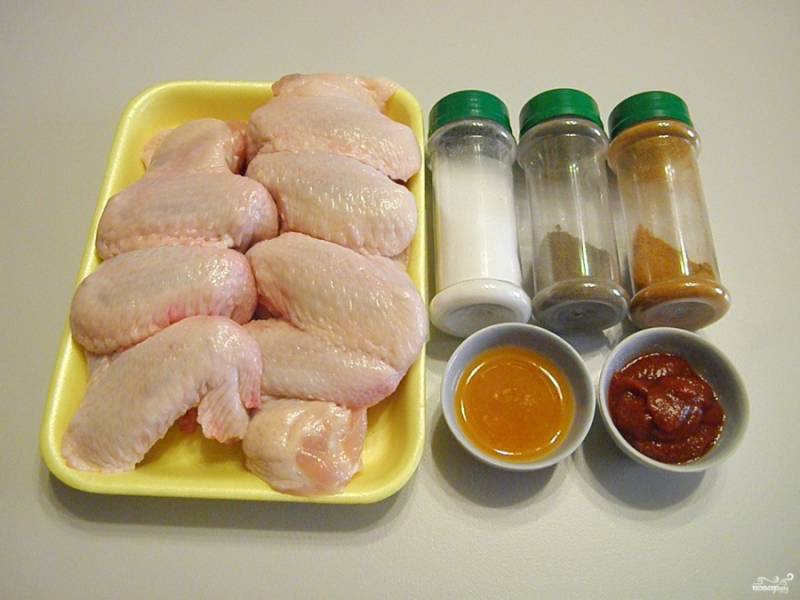 Приготовьте продукты. Крылышки тщательно вымойте, удалите остатки перьев, если есть. Просушите бумажными салфетками.