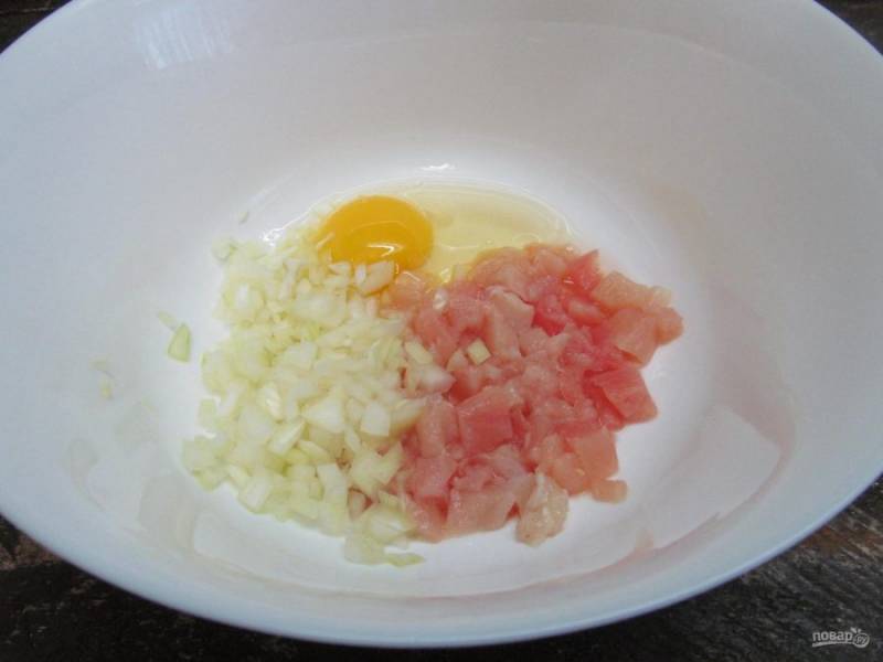 Мелко нарежьте репчатый лук, вбейте яйцо.