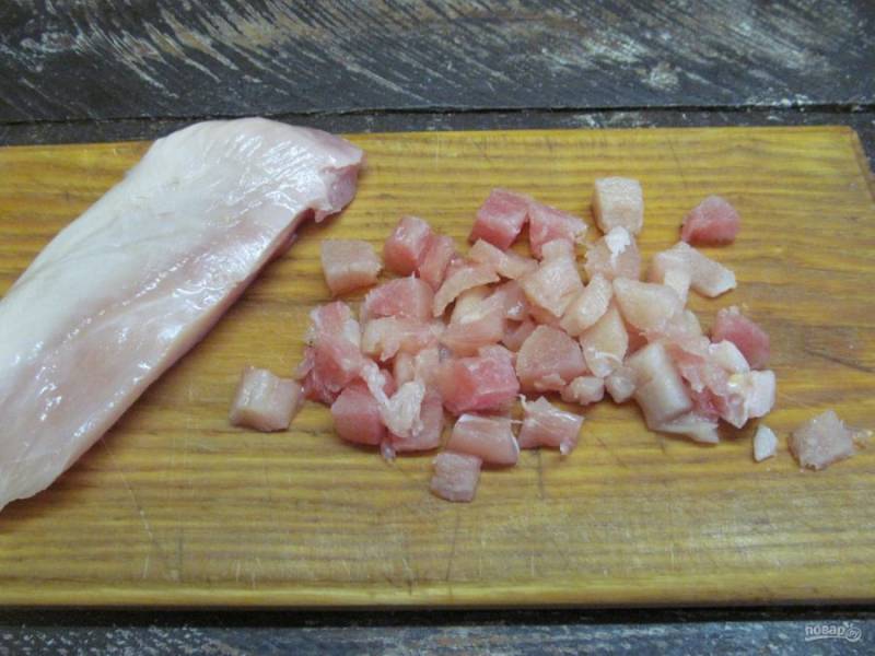 Куриное филе нарежьте мелким кубиком. Чтобы легче было нарезать, можно предварительно немного подморозить филе.