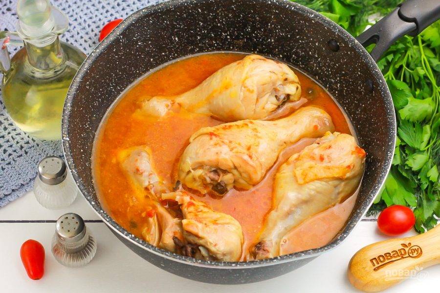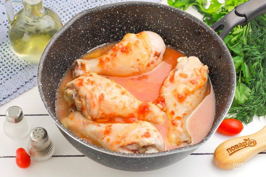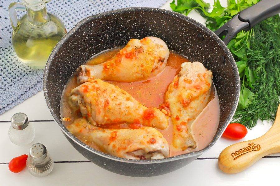 Накройте емкость крышкой, убавьте нагрев до среднего и томите куриные ножки еще 15-20 минут, время от времени переворачивая. Они отлично пропарятся под крышкой, вберут в себя томатный вкус и аромат. Если захотите загустить соус, то всыпьте в него 1 ст.л. муки или крахмала, перемешайте и проварите 1 минуту до густоты.