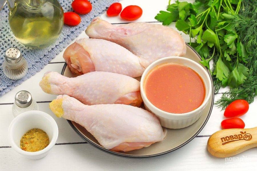 Подготовьте указанные продукты. Куриные ножки промойте в воде, снимите желтую кожицу снизу, если она присутствует. Обсушите бумажными салфетками.