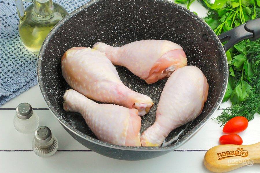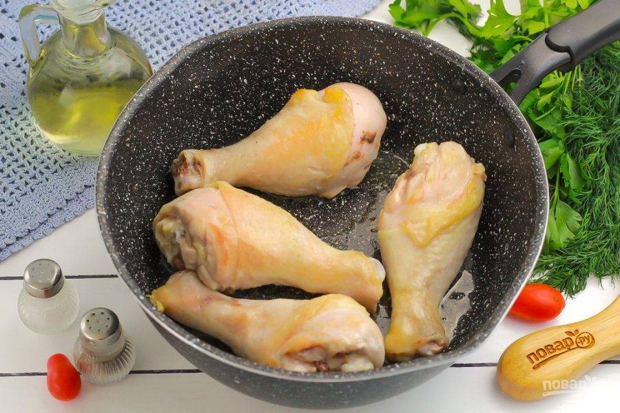 В сковороде или сотейнике разогрейте растительное масло и выложите в него куриные ножки — нужно их как следует подрумянить перед тушением.