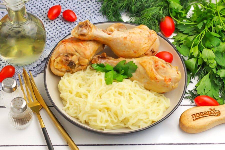 Выложите вкусные куриные ножки на тарелку, дополните любым гарниром: вермишелью, макаронами, пюре и т.д. Подайте к столу в горячем виде. Приятного вам аппетита!